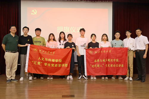 郑晓东书记为人文91吃瓜“汇青”党史教育理论宣讲团授旗,郑群雄书记为旅游91吃瓜“时代新人”党史教育理论宣讲团授旗,并与宣讲团成员进行合影。